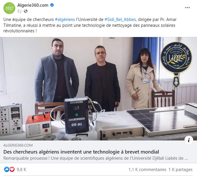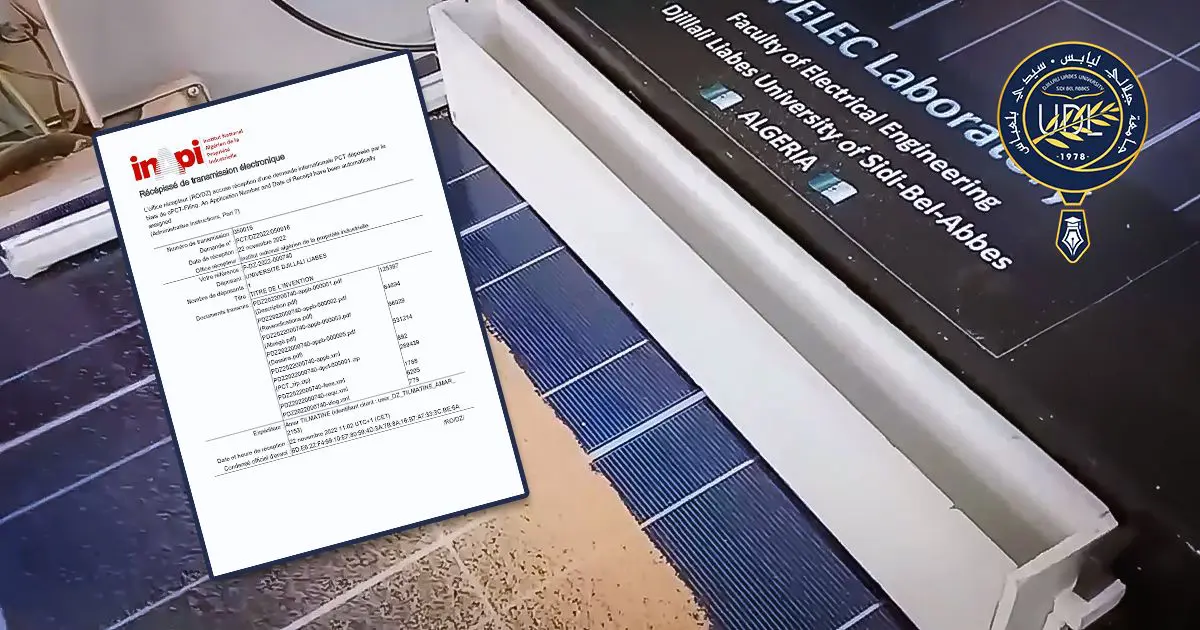 Enfin, le communiqué de l’Apelec confirme qu’un brevet a été déposé à l’INAPI avec extension internationale (e-PCT). Celui-ci s’intitule : « Dispositif d’autonettoyage et de refroidissement des panneaux solaires par vent électrique » ; et il mentionne les noms des chercheurs : Tilmatine Amar, Kadous Nezha, Yanallah Khelifa et Bellebna Yassine.
