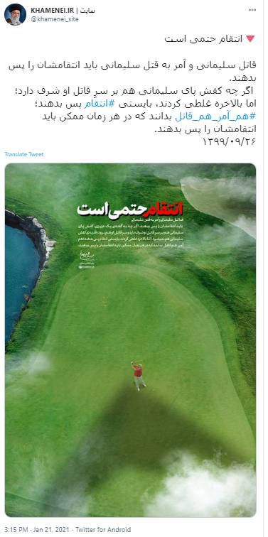 Un compte Twitter lié au guide suprême iranien, l’ayatollah Ali Khamenei, a posté, ce jeudi, 21 janvier, un message appelant à venger l’assassinat du général Qassem Soleimani et menaçant le Président américain sortant, Donald Trump.