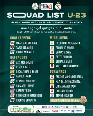 Pour cette édition des Jeux de la Solidité Islamique, le sélectionneur algérien, Noureddine Ould Ali, a concocté une liste de 23 joueurs pour former l’effectif de la sélection nationale des U23. La liste du sélectionneur Ould Ali est la suivante :