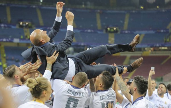Zizou porté par ses joueurs après avoir battu l’Athlético de Madrid en finale de la ligue des champions 2016(©D.R.)