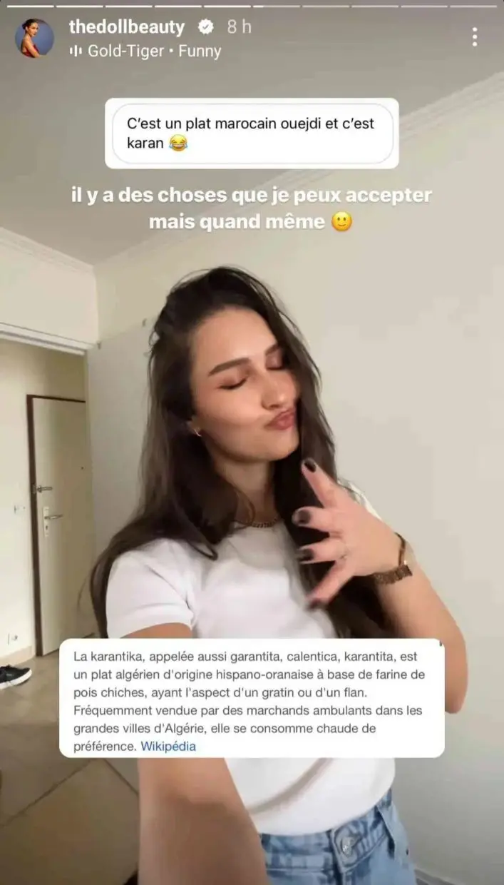 Quelques minutes après avoir posté ladite story, l’influenceuse a reçu un message d’un internaute indiquant que Garantita est un plat marocain originaire d’Oujda ! Celle qui compte 3 millions d’abonnés sur Instagram, s’est précipitée pour défendre le plat de sa ville natale. Dans le détail, Maroua a partagé une capture d’écran qui montre que Garantita est typiquement algérienne.