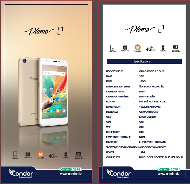 Le Condor L1 propose une batterie de 2800 mAh et est décliné en cinq couleurs : noirs, gris, coffee, bleu et gold. Le prix du nouveau Condor L1 est de : 16900,00 DA.