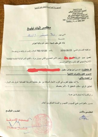« Hier, le 30 septembre 2019, des policiers en civil se sont déplacés afin de me présenter immédiatement au Service de la Cybercriminalité de Bab Ezzouar. Ayant constaté mon absence, ils sont revenus avec une convocation à m’y rendre dans les plus bref délais », a écrit le modérateur du groupe « Algérie Debout ».