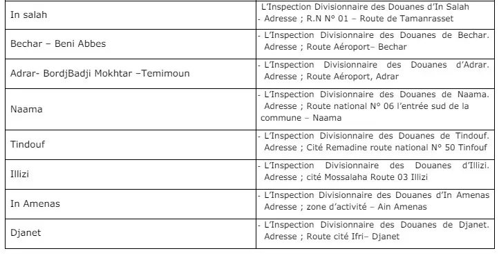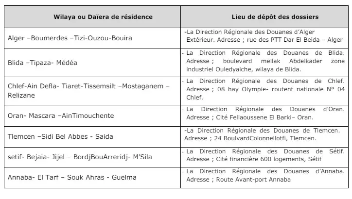 Le dossier de candidature doit être déposé au niveau des services des douanes repris dans le tableau ci-dessous :