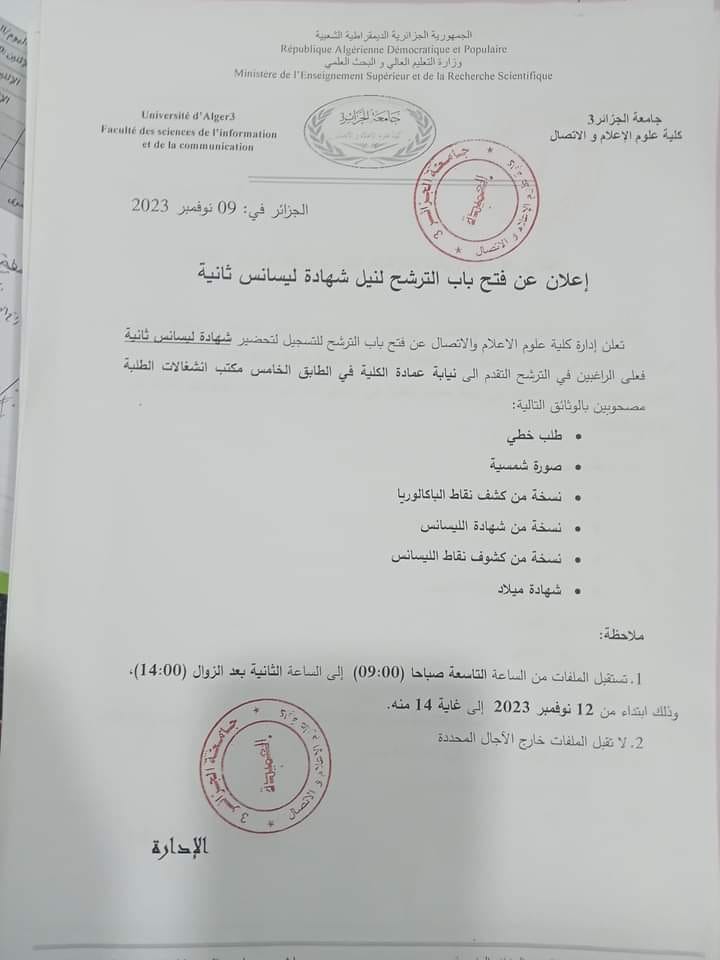 La Faculté des Sciences de l’Information et de la Communication de l’Université d’Alger 3 a officiellement lancé la période d’inscription pour l’obtention d’une deuxième licence. Cette annonce, émanant de la direction de la faculté, a été relayée à travers un communiqué officiel.
