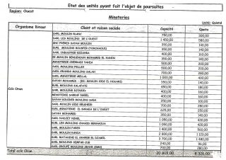 Le média électronique ALG24 a pu obtenir la liste comptant les noms et zones d’activités de ces minoteries. Nous remarquons sur le document que mis à part des Eurl Moulin Ouarti (Béjaia) et Sarl Semoulerie Amour de Mouzaia (Blida), les autres sociétés sont implantées à l’Ouest du pays notamment dans les wilayas d’Oran, Ain Temouchent, Relizane et Tlemcen.