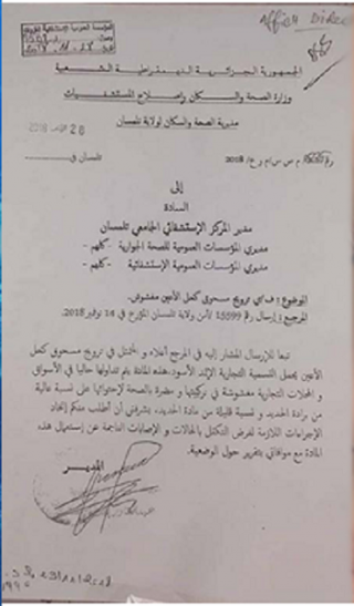 D’après la Direction de la Santé de la wilaya de Tlemcen, le produit toxique contiendrais un taux élevé de limaille de fer. Ainsi la Direction de la Santé incite les établissements de Tlemcen, à prendre les mesures nécessaires pour la prise en charge des cas d’atteinte dus à l’utilisation de ce produit.