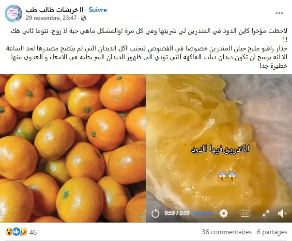 Les vidéos et photos qui circulent massivement sur Facebook montrent des mandarines littéralement criblées de vers. Les commentaires accompagnant ces images sont alarmants : « Attention, il y a des vers dans les mandarines ! Inspectez bien, surtout à l’intérieur des segments, pour éviter d’en manger. »