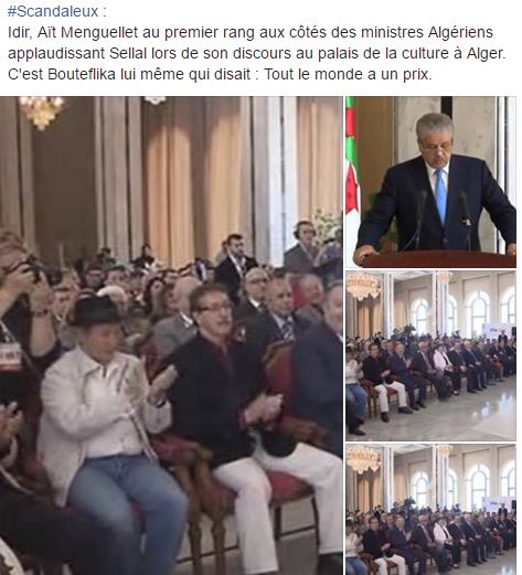 En effet, la présence des deux piliers de la chanson Kabyle, le gardien du temple Lounis et l’universaliste Idir, dans une cérémonie organisée par l’Office National des Droits d’Auteur et Droits Voisins et présidée par le premier ministre Abdelmalek Sellal, à l’occasion d’une opération de destruction d’un lot de deux millions de supports audiovisuels piratés, irrite les internautes Kabyles.