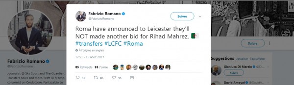 A en croire le très sérieux journaliste sportif italien, Fabrizio Romano (Sky italia), l’AS Rome a décidé de ne plus donner suite aux négociations avec Leicester city pour le transfert de Ryad Mahrez. C’est ce qu’il a publié sur son compte twitter ce mardi après midi (voir image en dessous).