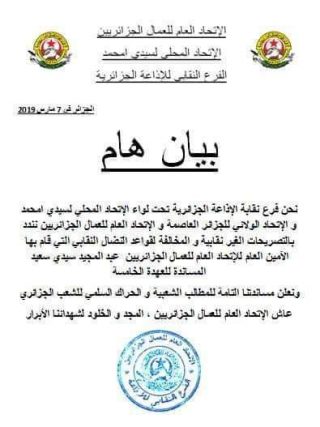 Dans un communiqué publié jeudi 07 mars 2019, la section UGTA de la radio nationale a « dénoncé les déclarations du Secrétaire général de l’UGTA, Abdelmadjid Sidi Said »et annonce son soutien au mouvement pacifique du peuple algérien.