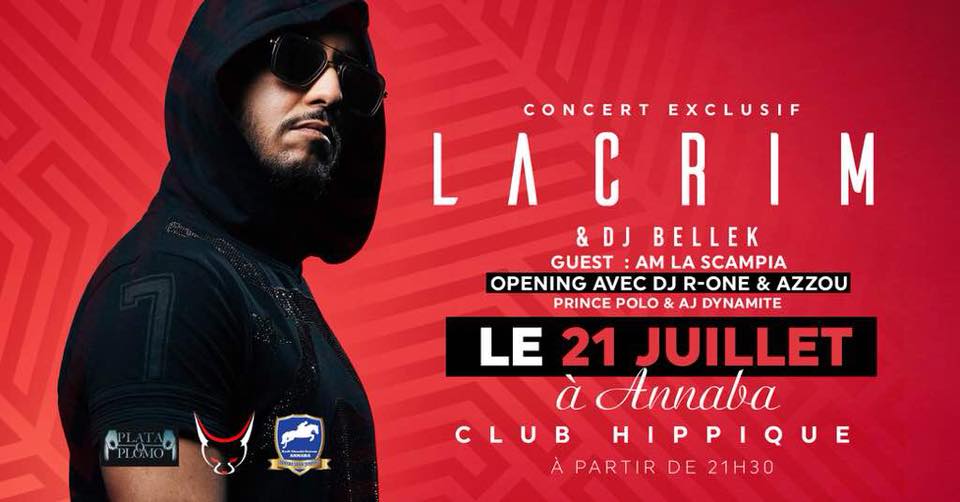 à la date du 19 juillet 2018, à partir de 21h30, le célèbre rappeur français d’origine algérienne LACRIM animera un concert exceptionnel et exclusif au Théâtre de verdure, Laadi Flici, d’Alger et au club Hippique de Annaba le 21 juillet 2018 à partir de 21h30 en la compagnie d’autres artistes.