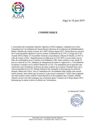 « Indignée » l’association des Journalistes Sportifs Algériens a exprimé son soutien au journaliste Nazim Bessol, directeur du journal Botola après l’annulation de son accréditation.