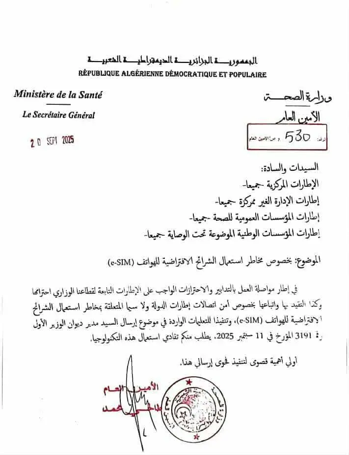 Une note officielle du ministère de la Santé circule depuis quelques jours sur les médias algériens. Elle impose l’interdiction pure et simple de l’utilisation des cartes SIM virtuelles, les e-SIM, dans le cadre des activités professionnelles.