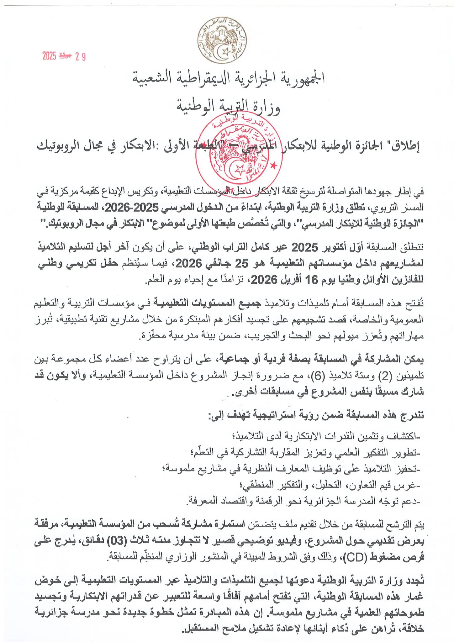 Enfin, le ministère renouvelle son appel à tous les élèves pour qu’ils saisissent cette occasion de mettre en œuvre leur ingéniosité, de partager leurs idées innovantes, et de participer activement à la construction d’une école algérienne tournée vers l’innovation et la réussite collective.