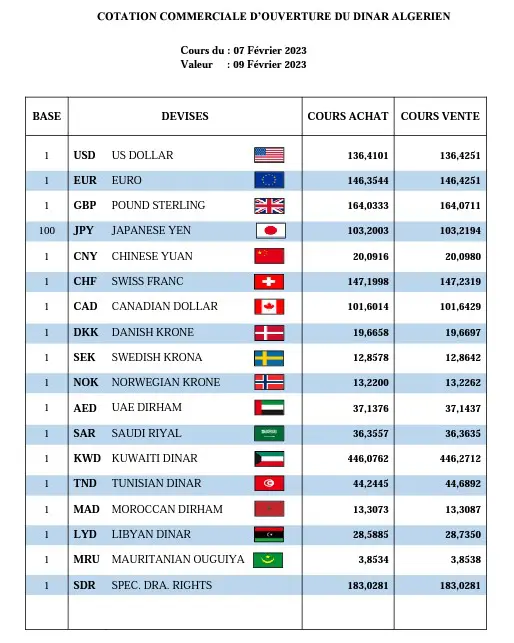 Pour ce mercredi 8 février 2023, les cotations officielles de la Banque d’Algérie indiquent que la monnaie européenne unique, l’euro, s’échange contre 146.35 dinars algériens à l’achat et contre 146.42 dinars algériens à la vente.