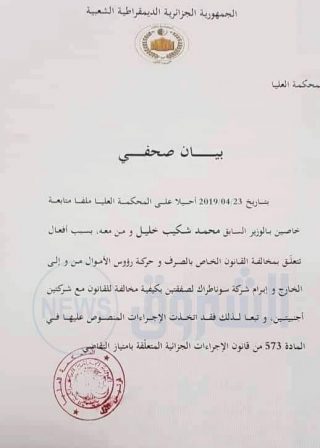 Un communiqué officiel du ministère de la justice déclare que le dossier de l’ex ministre de l’énergie et des mines, Chakib Khelil, a été transféré à la cour suprême. Chakib Khelil a été accusé de violation de la loi sur le décaissement des capitaux et la conclusion de deux accords entre Sonatrach et deux sociétés étrangères qui vont à l’encontre de la loi.
