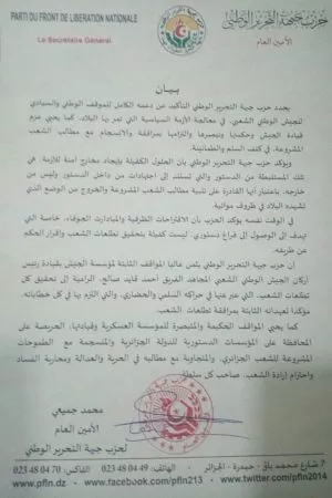 « Le FLN renouvelle son soutien total à la position souveraine et nationaliste de l’Armée dans la solution de la crise politique que traverse le pays. Le parti rejette toutes les propositions et initiatives déroulées jusque-là, affirmant que, ces propositions visent à conduire vers le vide constitutionnel et qu’elles ne peuvent répondre aux aspirations du peuple », li-t-on sur le communiqué.