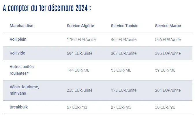 Les tarifs pour le transport de véhicules particuliers et utilitaires légers (pass. cars, minivans) seront également plus élevés vers l’Algérie, avec un prix fixé à 238 €, contre 178 € pour la Tunisie et 204 € pour le Maroc.