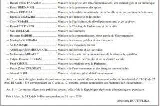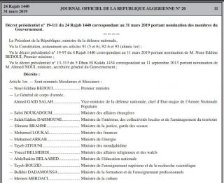 Le décret présidentiel n° 19-111 portant nomination des membres du Gouvernement a été publié au dernier journal officiel N° 20, du 31 mars 2019. Officialisant ainsi le gouvernement conduit par Noureddine Bedoui.