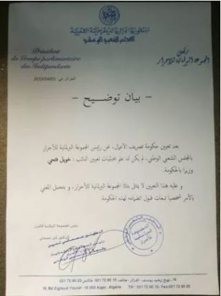 Le groupe parlementaire des indépendants renient la nomination Fethi khouil au sein du gouvernement de Bedoui. « Cette nomination ne nous représente pas. « Ont-ils annoncé à travers un communiqué.