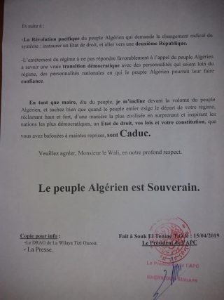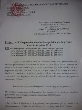 Un maire de Tizi-Ouzou plus précisément de l’APC de Souk El Tenine, slimane Khermous, s’adresse au wali dans le but de refuser de procéder à la révision ni à la préparation des élections suscitées, « et cela par respect à la volonté du peuple algérien dont nous tenons notre légitimité, aussi par notre conviction personnelle et par respect aux juges qui ont exprimé leur décision de ne pas accompagner ce processus de la honte ». Le maire a écrit dans sa lettre.