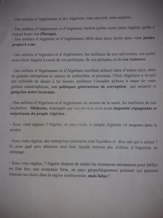 Il ne s’arrête pas la il fait rappeler au maire certaines vérité « Je vous informe que sous le régime qui vous a illégalement nommé, des milliers d’Algériennes et d’Algériens, des fonctionnaires, parmi eux travaillant pendant une dizaine d’années, ne touchent pas plus de 5000 DA par mois. » Il dénonce un esclavage moderne en citant les 4000 dinars accordé aux handicapés et aussi d’autres reproches qu’il adresse au pouvoir des milliers d’Algériennes et des Algériens, sont sans toit, sans emplois ; des milliers d’Algériennes et d’Algériens veulent quitter notre chère Algérie, quitte à risquer leur vie (Haraga) ; des milliers d’Algériens et d’Algériennes, lésés dans leurs droits dans votre justice propre à vous… »