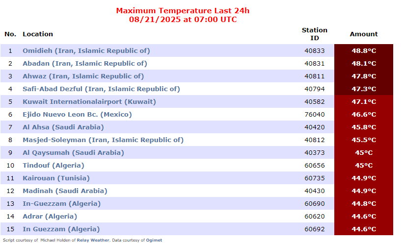 Le classement mondial est dominé cette fois par une ville iranienne, qui a frôlé la barre des 49°C, avec une température maximale de 48,8°C. Le site Eldoradoweather, reconnu pour son suivi précis des données météorologiques extrêmes à travers le globe, a également répertorié d’autres points chauds, notamment au Koweït, en Arabie saoudite, en Tunisie ainsi qu’au Mexique.