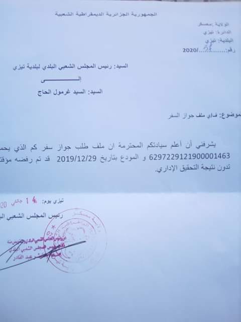 « J’ai l’honneur de vous informer que le dossier de votre demande de passeport déposé le 29/12/2019 a été rejeté temporairement en raison du résultat de l’enquête administrative », lit-on dans le document portant la réponse du maire à Hadj Ghermoul.