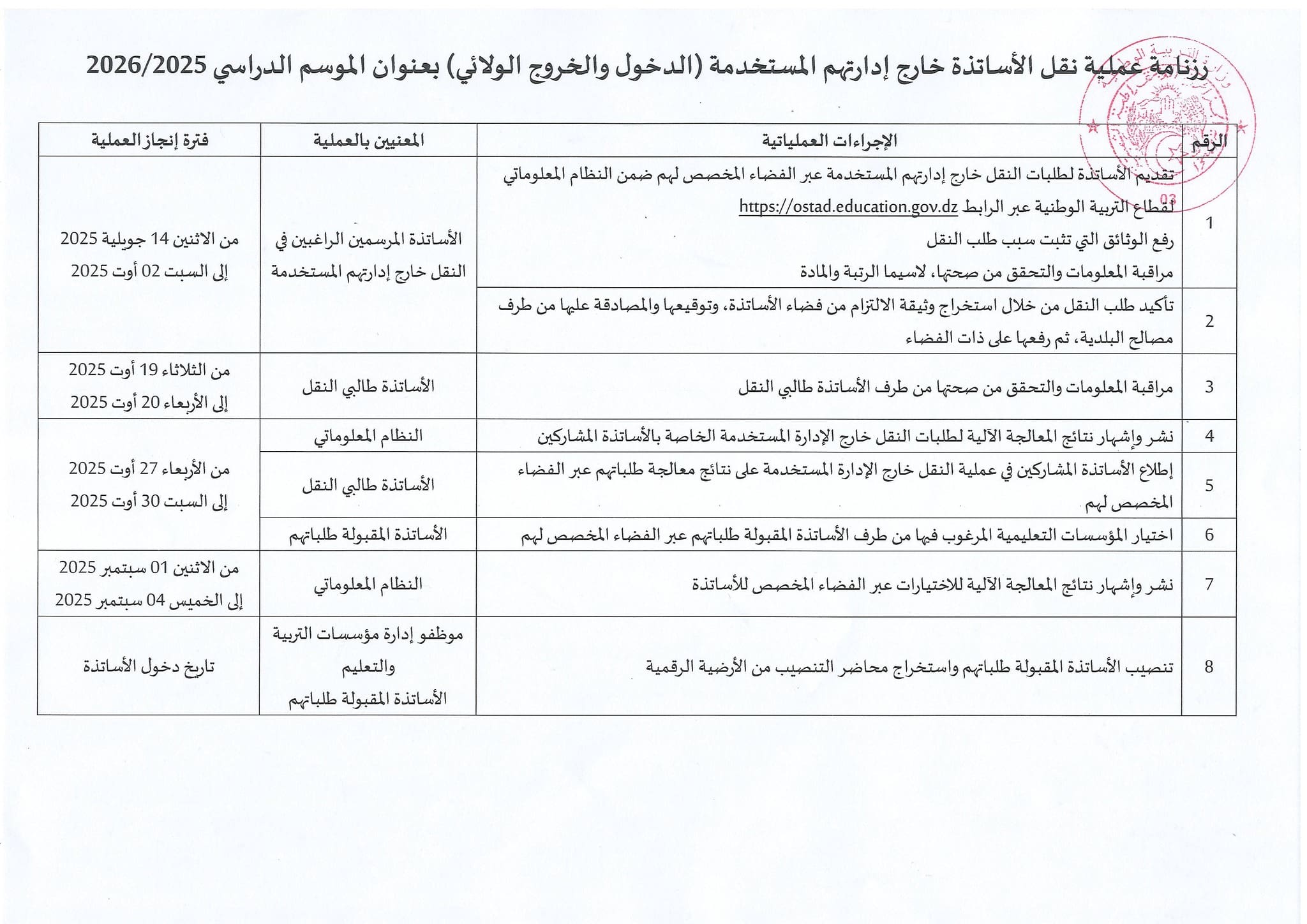 - Pour les enseignants, les demandes de mutation (entrante ou sortante) doivent être déposées via l’espace numérique dédié : https://ostad.education.dz, du lundi 14 juillet 2025 à 15 h jusqu’au samedi 2 août 2025 à minuit.