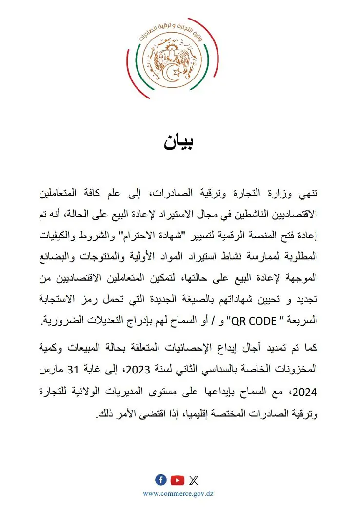 Le ministère du Commerce et de la Promotion des exportations a annoncé ce soir – jeudi 29 février 2024 – la réouverture de la plateforme numérique qui permet aux importateurs de retirer le certificat de respect des conditions et des modalités.