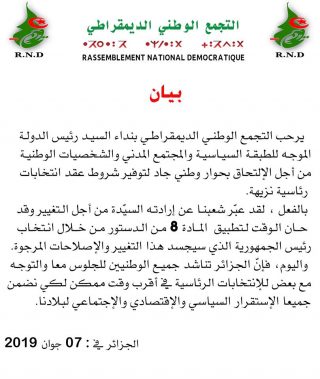 Le RND a appelé à l’application de l’article 8 de la constitution qui stipule que « Le pouvoir constituant appartient au peuple. Le peuple exerce sa souveraineté par l’intermédiaire des institutions qu’il se donne. Le peuple l’exerce aussi par voie de référendum et par l’intermédiaire de ses représentants élus. Le Président de la République peut directement recourir à l’expression de la volonté du peuple. Il est temps d’appliquer l’article 8 de la constitution à travers l’élection d’un président de la République qui concrétisera ce changement et les réformes revendiquées »