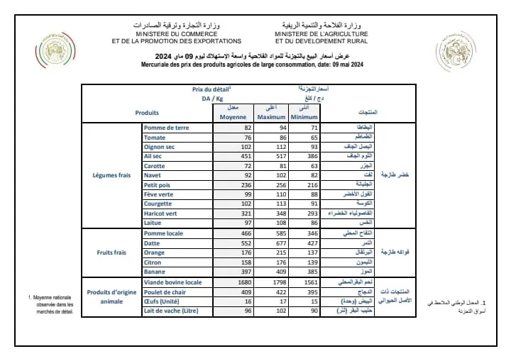 Le ministère de l’Agriculture et du Développement rural a publié, ce jeudi, les prix des fruits, légumes et produits d’origine animale sur les marchés.