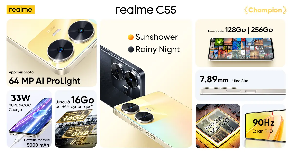 Realme, la marque de smartphones à la croissance la plus rapide au monde, vient de lancer le realme C55. realme C55 se présente comme » un champion du segment « , doté d’un appareil photo de 64MP, d’une charge rapide SUPERVOOC de 33W et d’un espace de stockage pouvant atteindre 256GB, le tout dans un look unique et branché inspiré de Sunshower. En conséquence, le realme C55 offre une expérience mobile holistique à un prix raisonnable à partir de 8+256 GO 39 999DZD 6+128 GO 35 999DZD ( Sur sa boutique officielle Ali express )