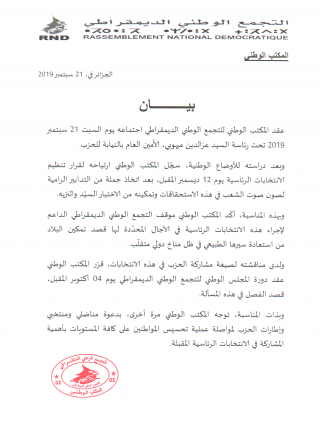 Dans un communiqué rendu public ce samedi, le rassemblement national démocratique (RND), a indiqué, que le parti n’a pas encore tranché la question de sa participation à la prochaine élection présidentielle prévue le 04 décembre prochain.