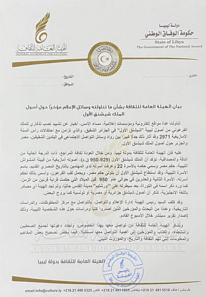 Il est important de noter que ce communiqué intervient en réaction à la polémique qu’ont suscité les origines du roi Amazigh Chachnaq sur les réseaux sociaux.