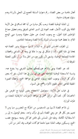 « Toute atteinte à n’importe quel juge, quelle que soit sa situation, attiserait la colère de tous et la position du syndicat serait alors violente quels que soient les risques et conséquences », a ajouté Issad Mabrouk dans e communiqué.