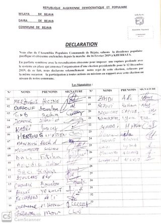 « En parfaite symbiose avec la revendication citoyenne pour imposer une rupture profonde avec le système en place qui annonce l’organisation d’une élection présidentielle pour le 12 décembre 2019, de ce fait, nous déclarons solennellement notre rejet de cette élection, refusons par la même occasion la participation à toutes actions ou missions en rapport avec cette élection au niveau de notre commune », conclut les membres de l’APC de Béjaïa.