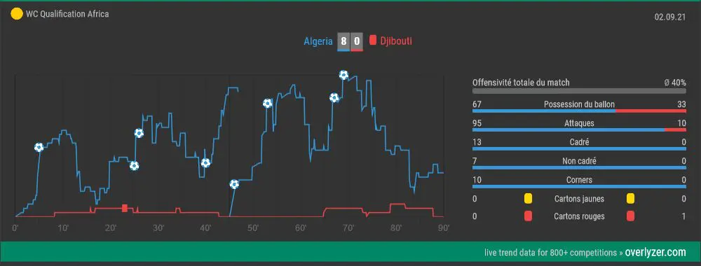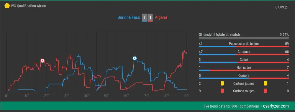 L’Algérie a gardé le contrôle du jeu après son but et le graphique montre que ses adversaires ont augmenté leur pression à partir de la demi-heure de jeu. Le Burkina Faso a fait preuve de plus de vitesse et de précision en deuxième mi-temps, ce qui a fini par payer grâce à un but d’Abdoul Tapsoba à la 64e minute.