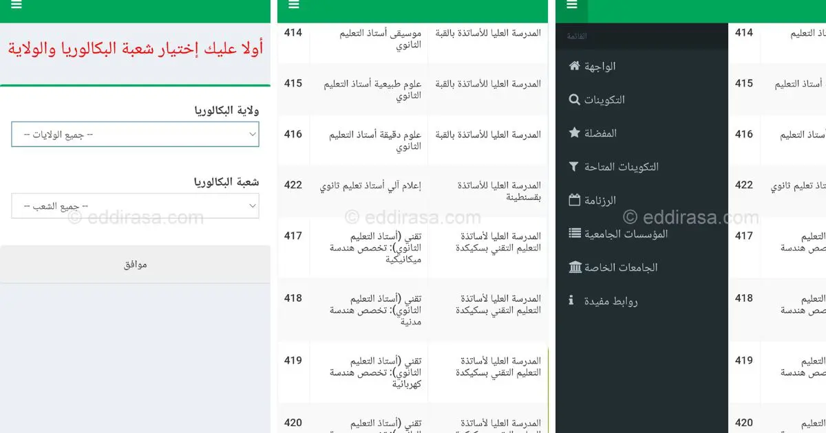 - « Traçage du parcours » « تكوين المسار » : cette application permet aux étudiants de découvrir leurs parcours professionnels après avoir choisi leur formation et leur spécialité. Elle offre également un espace d’information sur les services universitaires, les contacts et les données utiles.