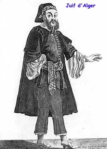 Cette communauté algéroise, considérée comme troisième classe des habitants d’Alger, se divise en trois castes : les juifs qui viennent d’Espagne portaient un bonnet rond de pointe Tolède, ceux qui venaient de France ou d’Italie coiffaient une espèce de bonnet en forme de chausse dont une extrémité leur tombe en arrière sur la nuque.