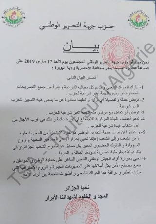 Les Mouhafeds du Front de libération nationale (FLN) ont apporté leur soutien, ce dimanche 17 mars, au mouvement populaire contre le prolongement du 4e mandat de Bouteflika.