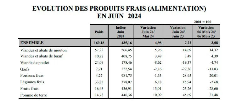Ces chiffres généraux sur l’inflation se traduisent par des hausses significatives au niveau des produits de consommation courante, comme le révèle une publication du ministère de l’Agriculture et du Développement rural publiée le 25 juillet 2024. Pour mieux cerner cette réalité, examinons de plus près l’évolution des prix de certains légumes et fruits.