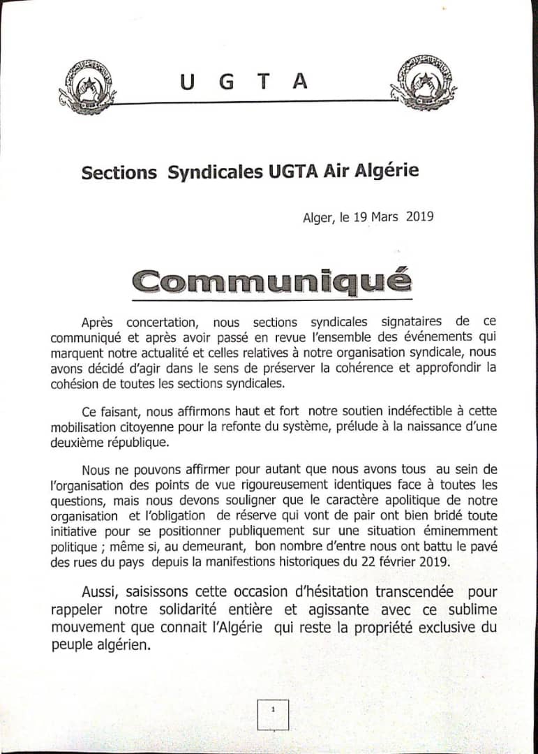 Les Sections Syndicales UGTA d’Air Algérie, annoncent leurs soutient au mouvement populaire contre le prolongement du 4e mandat de Bouteflika