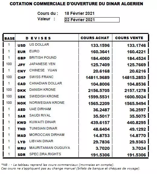 Parallèlement, le marché officiel des devises continue également d’observer une stabilité des devises principales. En effet, les cotations officielles de la Banque d’Algérie ont indiqué, ce vendredi, 19 février, que l’euro s’est échangé à 160.36 dinars à l’achat et à 160.42 dinars à la vente. Concernant le dollar américain, il s’est échangé à 133.15 dinars à l’achat et à 133.17 dinars à la vente.