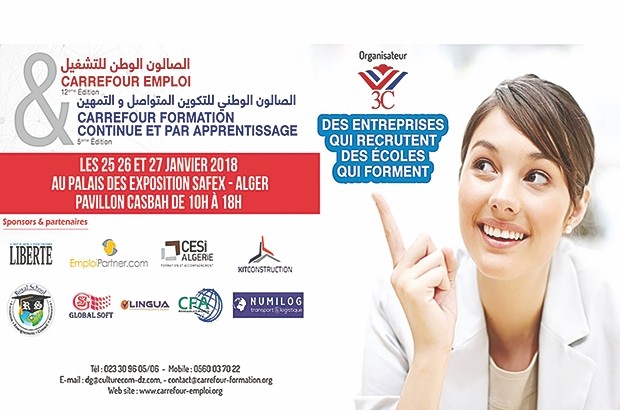C’est sous la thématique “L’emploi et la formation pour booster le développement économique” que se tient en janvier 2018 la 12e édition du Salon national “Carrefour de l’emploi” qui accueillera par la même occasion la 5e édition du Salon national “Carrefour de la formation”. Organisés par l’agence 3C, spécialisée en conseil, communication et événementiel, ces deux événements s’étaleront du 25 au 27 janvier à la Safex (Alger). Les deux salons se veulent être, selon les organisateurs, un carrefour de rencontres entre les entreprises et administrations en quête de compétences et de nouvelles recrues, les écoles et organismes de formation, ainsi que les personnes à la recherche d’un emploi, d’un stage ou d’une formation. Pour la première fois, l’événement, qu’abritait auparavant l’Office Riadh El-Feth est délocalisé à la Safex (Pins maritimes).