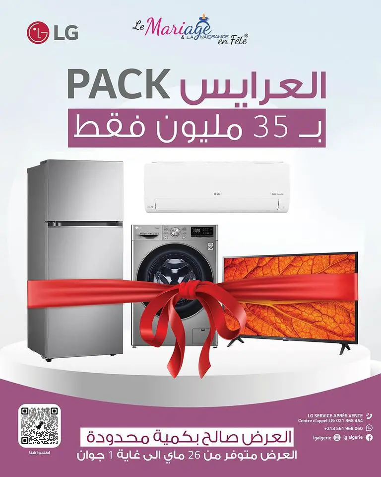 LG a spécialement préparé le « pack La3rayess » pour l’occasion, comprenant une TV 43″ FHD, un climatiseur ON/OFF 12000 BTU, une machine à laver Vivace 10.5 KG grise et un réfrigérateur 395L Top freezer. Ce pack complet est offert à un prix exceptionnel de 350 000 DA seulement, au lieu de 404 600 DA. Profitez de cette offre exclusive pour équiper votre maison avec des produits de qualité supérieure, conçus pour faciliter votre vie quotidienne.