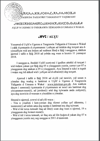 Par ailleurs, le ministère de l’Intérieur a déjà publié ce mercredi 10 janvier son premier communiqué en Tamazight. Le texte en question écrit dans les deux langues officielles concerne la prochaine saison du Hadji et lance un appel aux citoyens algériens désireux d’accomplir le grand pèlerinage à la Mecque en 2018 de s’inscrire sur le site ou bien au niveau des mairies à partir de jeudi 11 janvier, pour le tirage au sort.