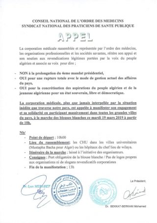 Le conseil national de l’ordre des médecins soutient les revendications du peuple exigeant le départ du système politique actuel et appelle tous les travailleurs de la santé à se rassembler Mardi Pour dire non à la prolongation du 4e mandant de bouteflika.