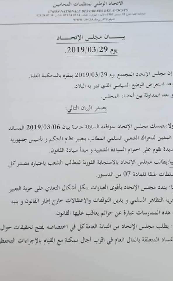 L’Union qui regroupent les ordres régionaux des avocats condamne » les interpellations et arrestations faites en dehors du cadre juridique, en avertissant que ces pratiques sont des crimes punis par la loi » et demande également « »la satisfaction immédiate des revendications du peuple, source de tout pouvoir selon l’article 7 de la Constitution »